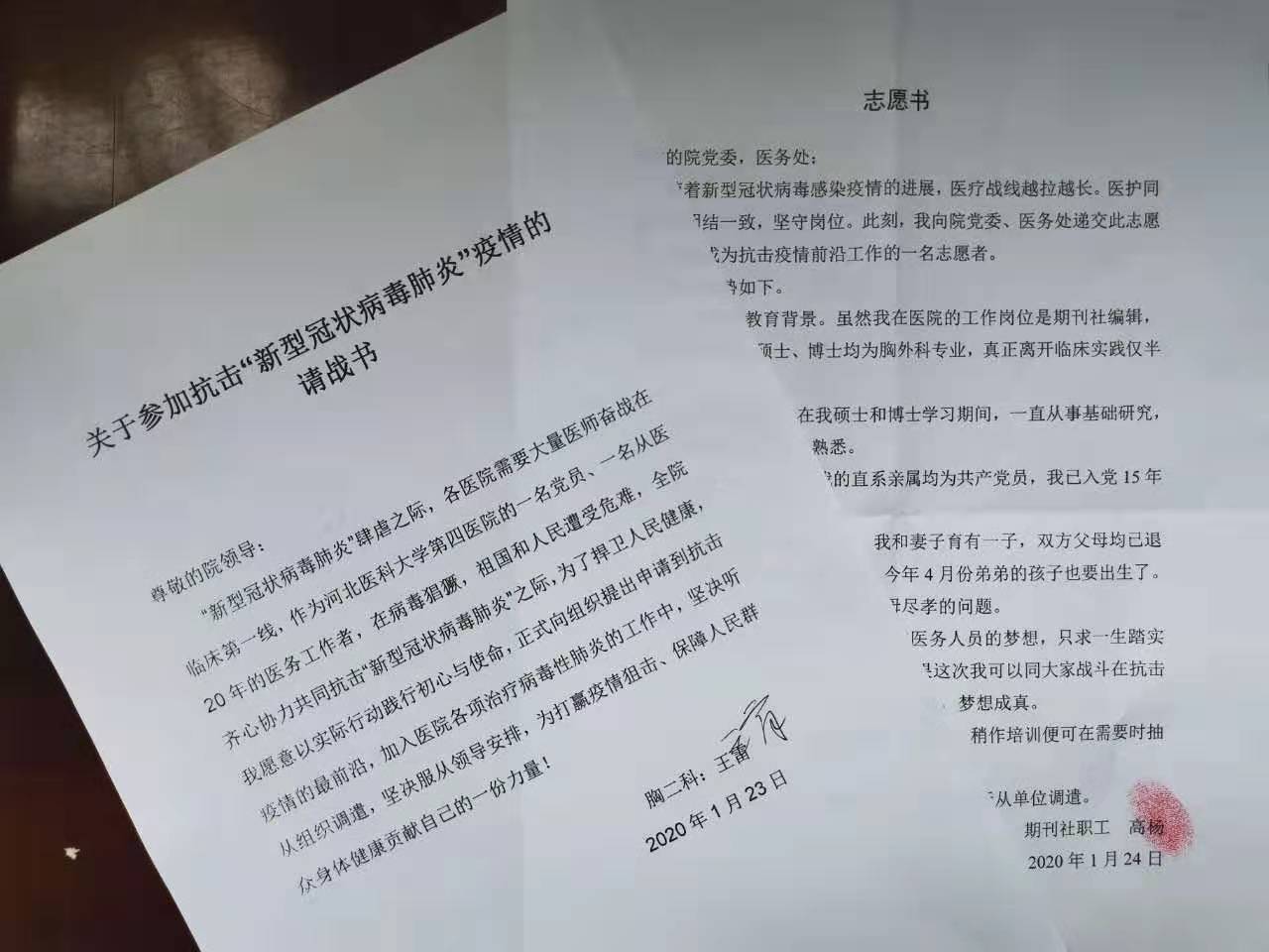 党委书记单保恩第一时间递交了请战书,他言辞恳切,“人民群众的生命安全高于天,疫情就是命令,防控就是责任,我们医务工作者就是战士,必须勇敢地冲向战场。我作为医院党委书记,必须坚持在抗击新型冠状病毒感染的肺炎疫情防控与救治工作的最前线,必须做到守土有责,接受防控斗争的考验和大家的监督。”徐金升院长也率先垂范,积极请战,“作为一名曾经参与2003年抗击非典的老医生,同时作为医院院长,深知人民群众的生命重于泰山,疫情就是命令,防控就是责任。为此,我郑重向医院党委申请:及时掌握疫情,科学制定我院防控预案,并认真组织实施落实,做到守土有责。在医院党委的正确领导下,为最终战胜疫情贡献自己的力量。”医院其他院领导也积极递交了请战书。在院领导的感召下,全院上下掀起了请战热潮,涵盖了临床、医技、护理、药学、行政后勤等各个科室,请战书如雪片,全院抗击疫情的斗志昂扬,有的人专程从老家赶回来,有的还处于哺乳期,有的是夫妻共同请战,他们纷纷要求到一线去,要到最需要的地方去!不计报酬!不论生死!坚决服从组织安排,随时听候调令!