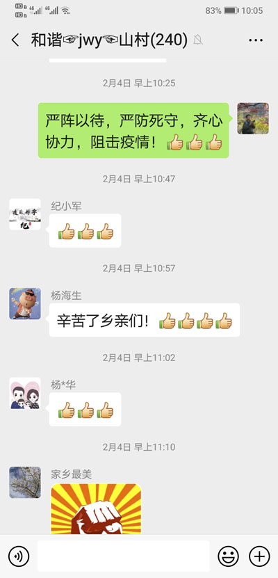 阻击疫情在农村传播蔓延是联防联控的关键环节。按照上级要求,把做好外地返乡人员的管控和日常监测作为疫情防控工作的重点,对全村实行了封闭式管理,在村口设立检查站,安排人员24小时在岗值班。与此同时,对全村250户常住人口和外来人员逐户逐人进行了拉网式排查,不落一户、不落一人。对4名由湖北仙桃市来村探亲的外来人员和密切接触者进行了医学隔离。