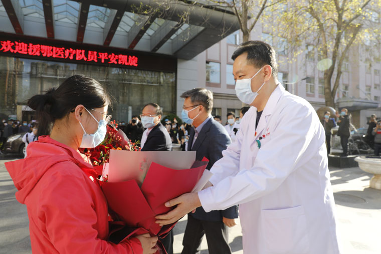 本是乍暖还寒的季节,我院前庭广场却是一派暖意。医院为队员们举行了简捷而热烈的欢迎仪式。河北医科大学党委常委、党委副书记倪铁军,党委常委、副校长闫宝勇等领导到现场为勇士接风。学校党委常委、副校长、我院党委书记单保恩,院长徐金升和全体院领导、队员家属以及相关科室人员共同迎接亲人回家。领导、家属和同事为勇士们献上了代表思念和祝福的鲜花。