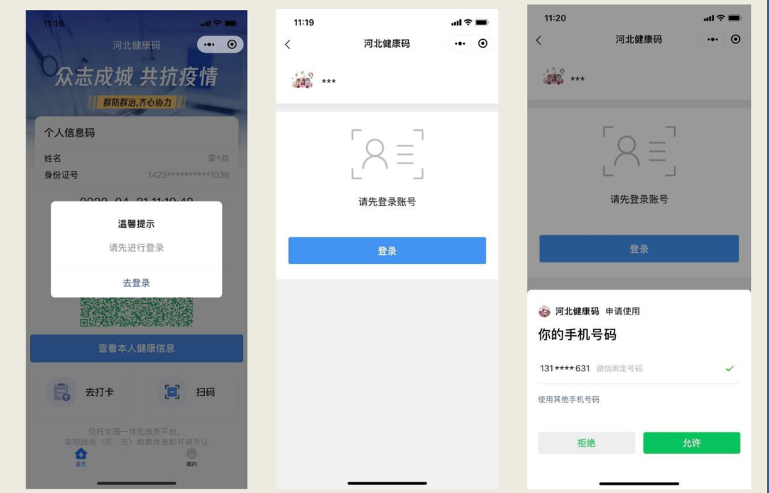4.出示“健康码”,供“扫码”使用。如果显示“绿码”,可以通行;如果显示“黄码”或“红码”,需核实健康状态。(颜色实例如图)