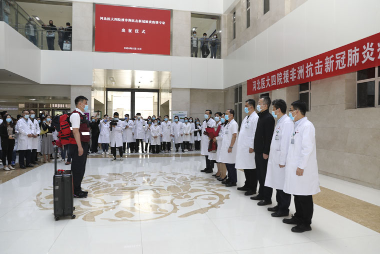 壮行仪式上,党委书记单保恩代表医院党政领导和全院职工对王琦同志关键时刻挺身而出、勇于奉献的精神表示衷心的感谢,并为他献上代表胜利的鲜花。单书记说到,“今年年初新冠肺炎疫情肆虐我国,给全国人民的生命健康带来了威胁,但是在习近平总书记和党中央的正确领导下,经过全国人民共同抗击,疫情发展得到了有效的控制,同时我们也积累了一定的经验。目前,国际防控工作不容乐观,习近平总书记指出,流行性疾病不分国界和种族,是人类共同的敌人。国际社会只有共同应对,才能战而胜之。今天,王琦同志肩负着我院、河北省、国家的光荣使命,远赴非洲执行新冠肺炎的救助任务。希望你把自己精湛的技术和勇于奉献、不怕吃苦的四院精神也带到那里,出色的完成任务。”单书记还嘱咐到,“医院党委和全院职工是你最坚强的后盾,会为你解除一切后顾之忧,祝你此行一切顺利。”徐金升院长等领导也纷纷叮嘱王琦在克服困难、完成工作的同时,时刻做好安全防护,保护自身安全。