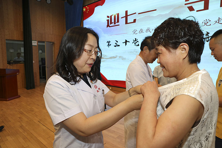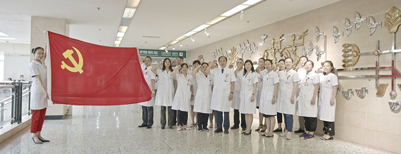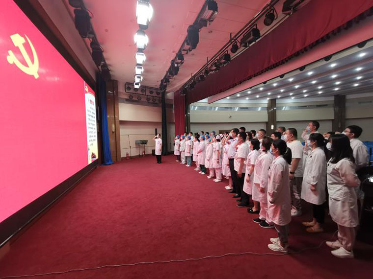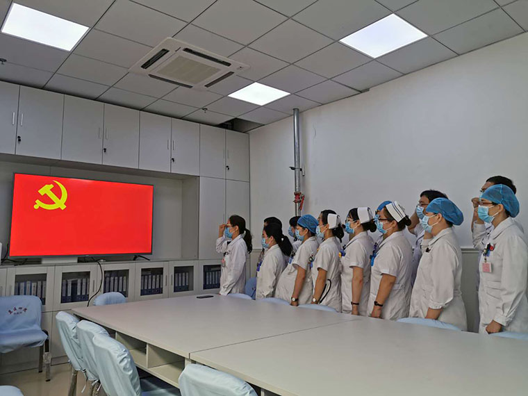 34党支部全体党员一起高唱国歌,在党旗下宣誓,重温入党誓词并以实际行动庆祝党的生日:为患者及家属进行导诊、导医、就诊流程指导等多种形式的服务活动。