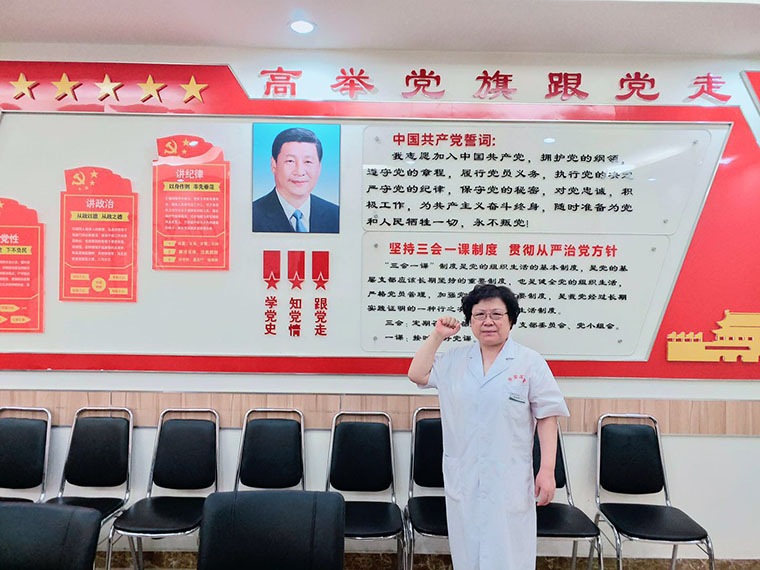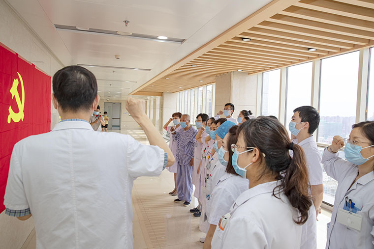 第三党支部举行重温入党誓词活动,其中一位90岁高龄且已有64岁党龄的老年患者也积极参与其中,他激动地说:“我56年入党,跟着党走,工作了几十年,特别希望党和国家越来越好!”