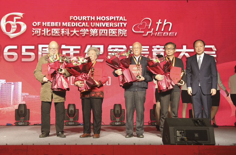 我院用精心准备的配乐朗诵《大医精诚》,舞台剧《战癌壮歌》、《心系赞皇》,舞蹈《迈进新时代》、《红烛》、《共圆中国梦》,民乐演奏《良宵》,歌曲《为了谁》,快板表演《医路逐梦》,合唱《河北医大四院院歌》,大型歌舞《白衣薪火》以及老前辈和青年人拍摄的祝福视频等形象生动地展现出一代代四院人在不同历史时期,用医者仁心和大爱无疆诠释医学誓言的感人事迹,表达了对建院65周年的热情庆祝和殷切祝福。现年85岁的林元珠教授在接受采访时说:“能够参加建院65周年纪念表彰大会让我感到非常荣幸,支撑我在医学领域不断探索、努力工作的动力就是因为我有为共产主义事业奋斗终生的伟大信仰。希望年轻的四院人能够胜过我们,长江后浪推前浪,一代更比一代强。”