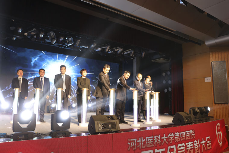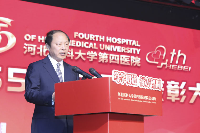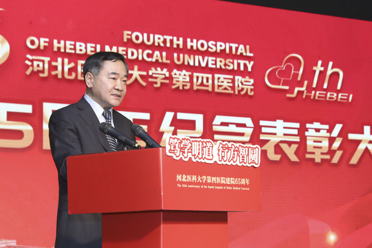 河北医科大学党委书记翟海魂致辞,他指出,1955年,河北纺织管理局医院成立,1958年,划归河北医学院,更名为河北医学院第四医院,从此,第四医院开启了与学校风雨同行、共担使命的时代。65年来,一代代四院人秉承医大之精神,“育天下英才,为民众除病痛、谋健康”的初心使命,严谨治学,仁心行医,推动医院稳步前进,取得了令人骄傲的成绩。如今,第四医院已经发展成为一所集医疗、教学、科研、预防、保健于一体,管理先进、运作规范、学科齐全、特色显著的综合性三级甲等医院。四院的医疗水平、教学水平赢得了社会各界的普遍赞扬。