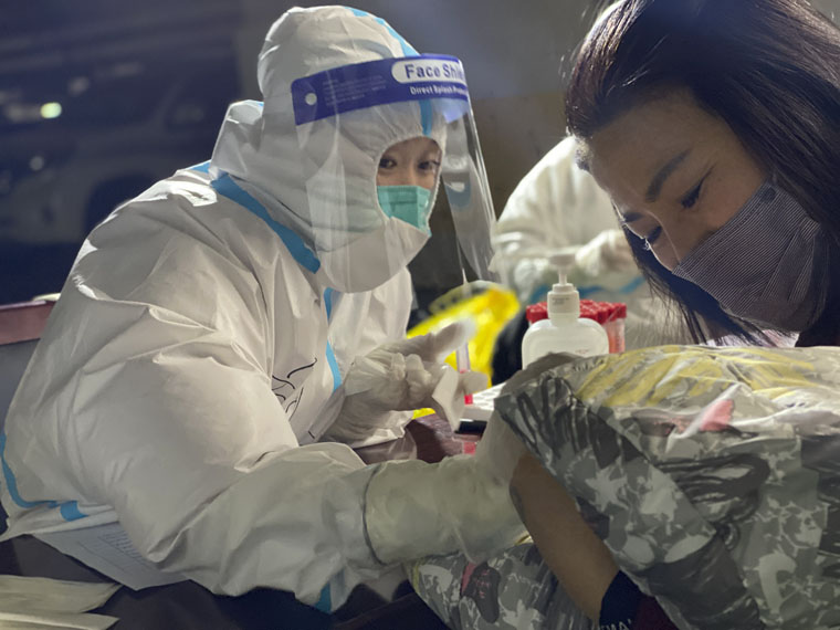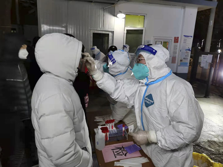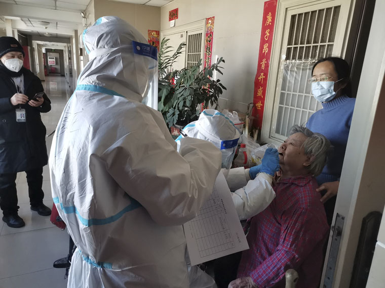 社区里有一些行动不便的老人,需要上门采集核酸。由于大多数小区没有电梯,医护人员只能穿着防护服爬楼梯,每一步都觉得呼吸困难。从户外走进单元门里,她们的眼镜和面屏就会形成厚厚的水雾,给采集工作造成困难,之后再到户外走一会儿,面屏上的水就结成了冰。有的采集人员单在一个小区就爬了近一千级台阶,冻得小腿直打哆嗦。