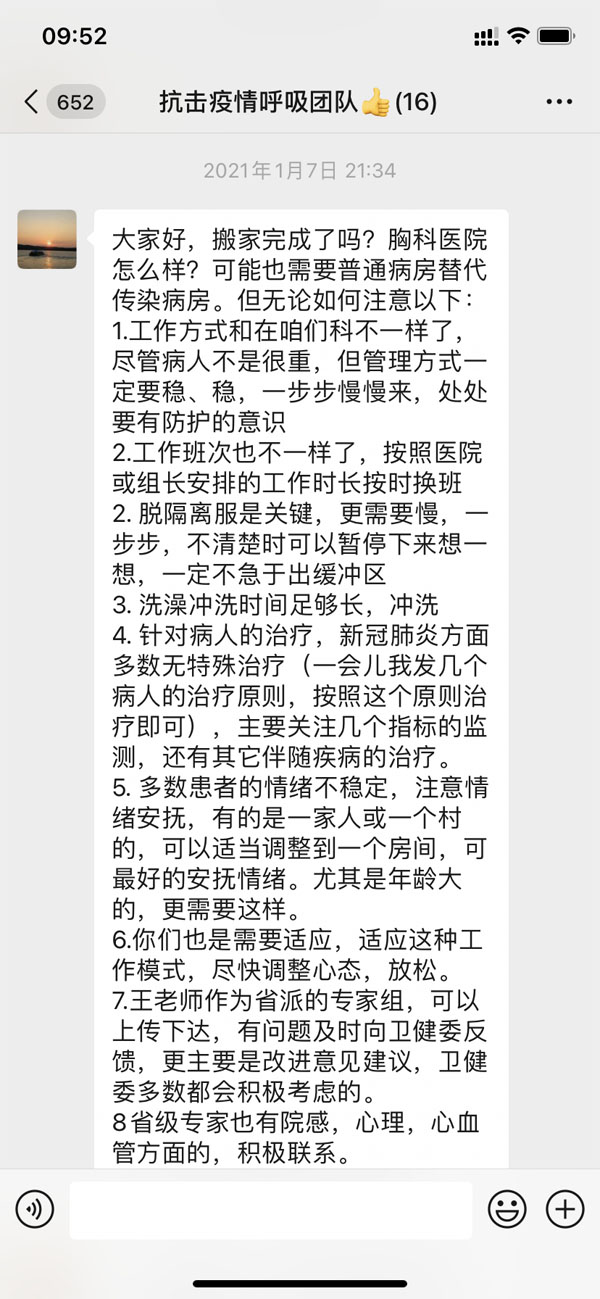 虽然队员们因为工作需要暂时离开了科室、离开了医院,但是科室和医院还依然时刻惦记着大家。呼吸内科丁翠敏主任每天都在微信群里关心着每名队员的情况,从衣食住行、工作问题,到身体情况、心理变化,事无巨细。对大家遇到的问题,及时反馈,为队员们解决了很多工作和生活中的现实困难。让大家充分感受到呼吸内科作为一个整体,具有强大的凝聚力,是一个团结有力的集体。医院领导为了保障队员们工作、生活的合理有序,派专人开展协调工作,并多次关心、询问队员们工作生活中遇到的实际困难,运送慰问物资,让每一名医疗队员都感受到了医院大家庭的温暖。