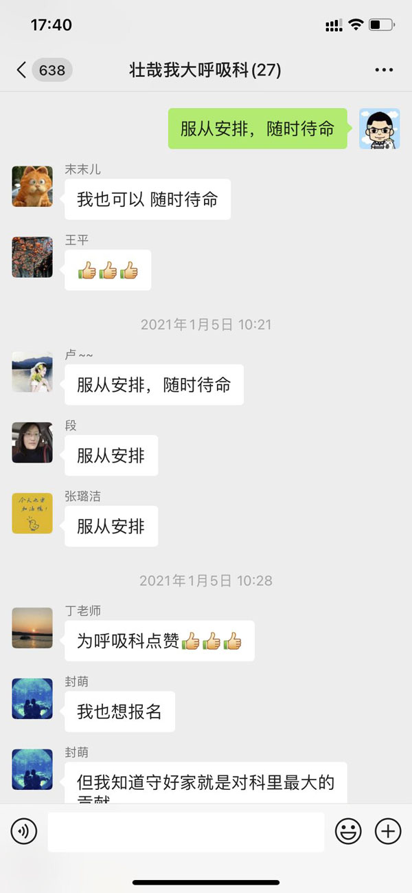 1月5日上午,呼吸内科接到我院抽调医护人员参与组建抗疫医疗队的任务,短短的几分钟内,科室微信群里请战的信息滚动刷屏。没有华丽的辞藻,没有空洞的口号,一句简单的“我报名”,体现了呼吸内科医护人员面对疫情无所畏惧、勇敢向前的亮剑精神。