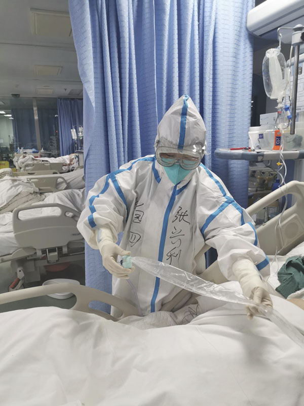 在这里收治的都是全市最危重的新冠肺炎患者,病情复杂多变,生活自理能力差。部分病人因病情需要给予了有创呼吸机和ECMO治疗,俯卧位通气,一个看似简单的翻身动作,也需要多人协作才能完成,耗费巨大的体力。因为患者生活自理能力差,护理组在完成日常护理、监测指标整理总结的同时,还要承担起照顾患者饮食起居的工作。因为重症患者病情变化快,检测指标多,抽血采样等工作量也较平时大了许多。每个班次下来,防护服里的洗手衣都是湿透的状态。