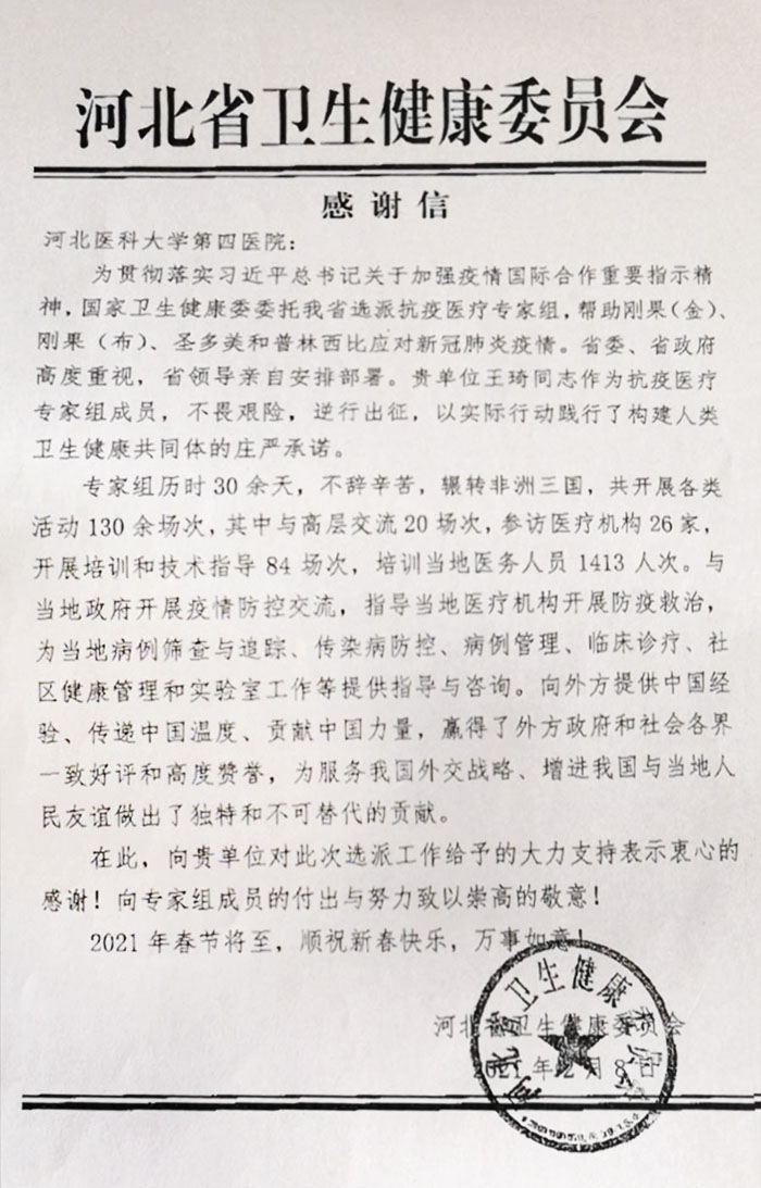 202128日,河北省卫生健康委员会对我院选派王琦同志作为河北省援非抗疫医疗专家组成员,帮助刚果(金)、刚果(布)、圣多美和普林西比应对新冠肺炎疫情表示感谢,称赞王琦同志以实际行动践行了构建人类卫生健康共同体的庄严承诺。