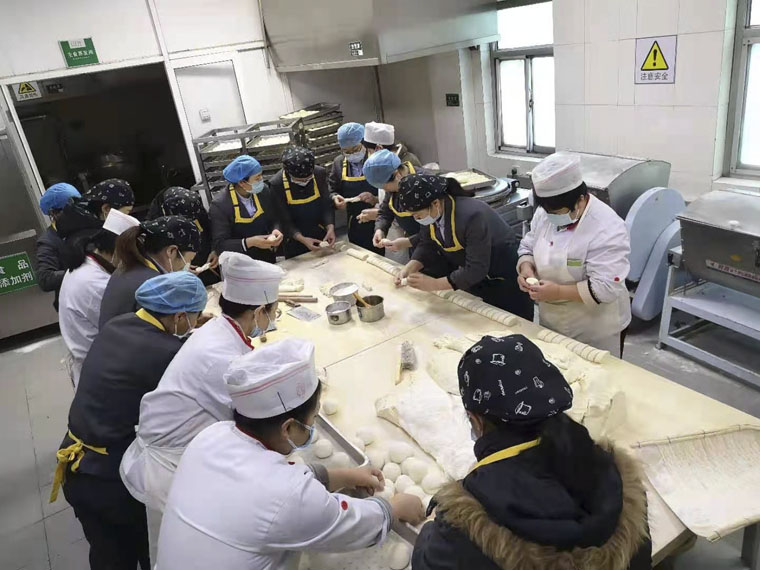 食堂所有人员加班加点工作,由于上午准备的菜品、主食只够中午使用,下午和晚上还要加班准备晚餐和第二天早餐的食品。大家每天工作10几个小时,虽然辛苦,但都顺利完成了任务,他们在工作群里相互鼓励,“现在要说不累是假的,但这就是我们应该做的”,一位职工说道。