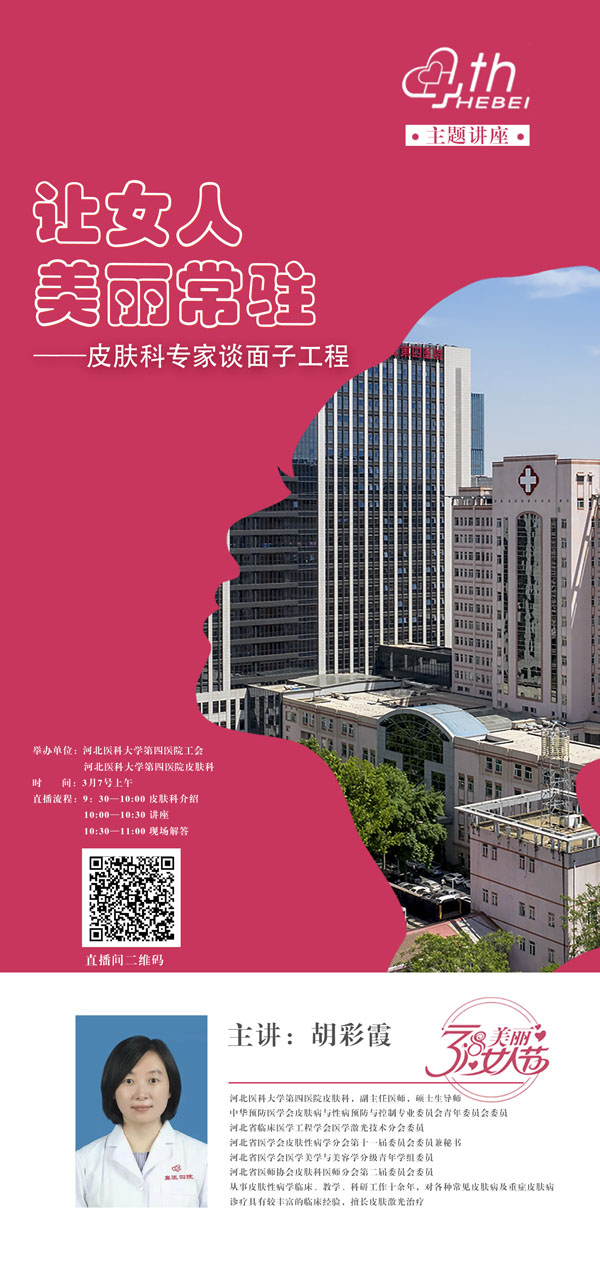 在第111个“三八”国际妇女节到来之际,为了更好地关爱女职工和女性同胞,工会携手皮肤科于37日上午开设“云课堂”惠及女职工。皮肤科主任王文氢简单介绍了我院皮肤科的各种业务和设备,随后,擅长皮肤激光治疗的胡彩霞老师以“让女人美丽常驻——皮肤科专家谈面子工程”为题进行讲座,她用通俗易懂的语言为女性朋友传授如何认识肤质、正常皮肤如何护理等知识,并介绍了女性皮肤护理常见问题,黄褐斑、玫瑰痤疮的诊断及治疗等。
