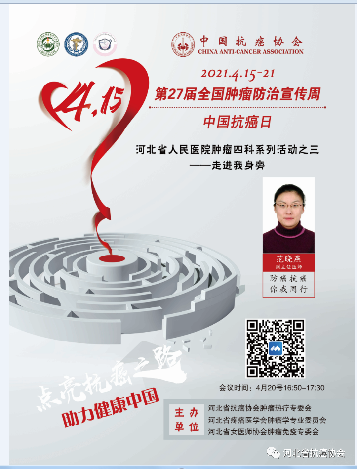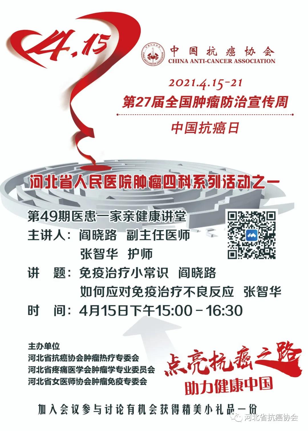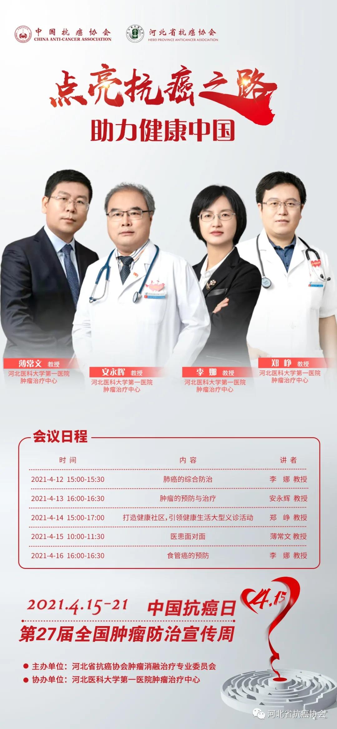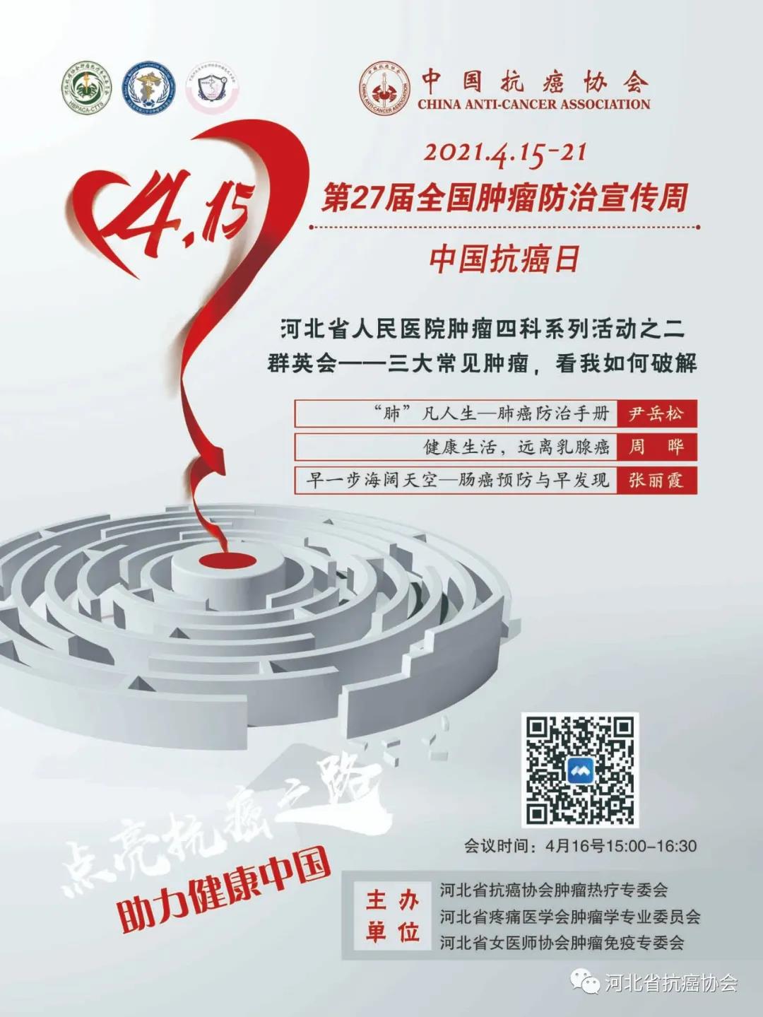 在为期一周的活动中,河北省抗癌协会、河北省癌症中心、各专业委员会、各市抗癌协会都将相继举办形式多样的防癌科普宣传,以医务工作者火热的爱心点亮抗癌之路,助力健康中国!