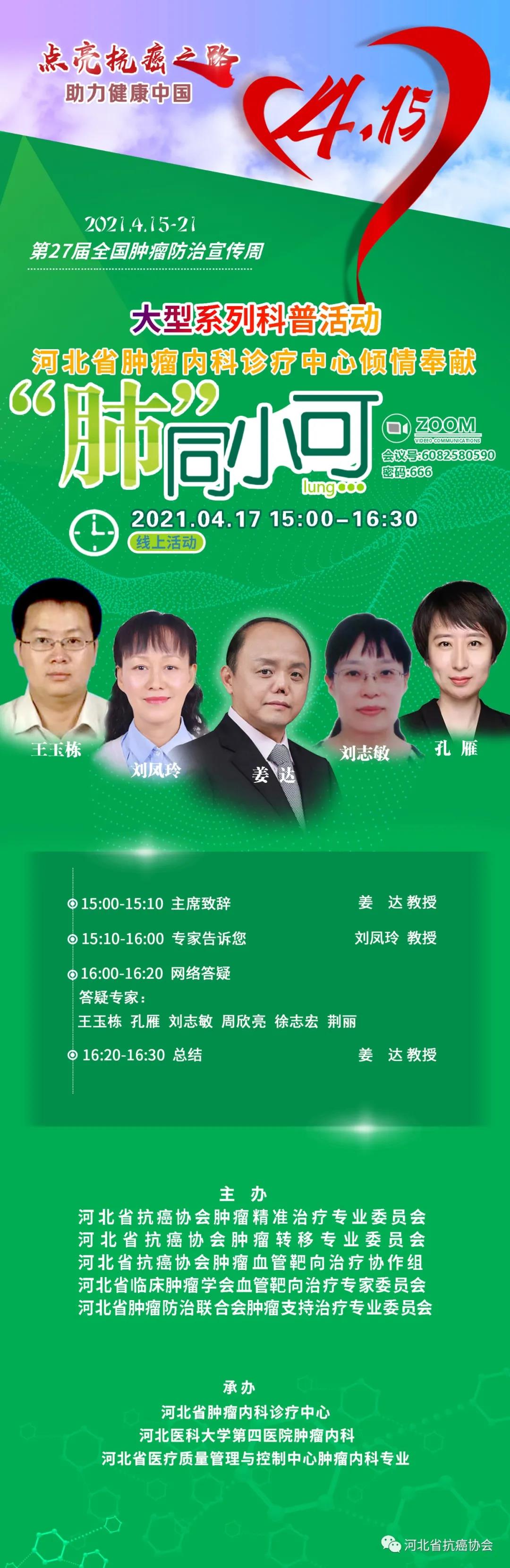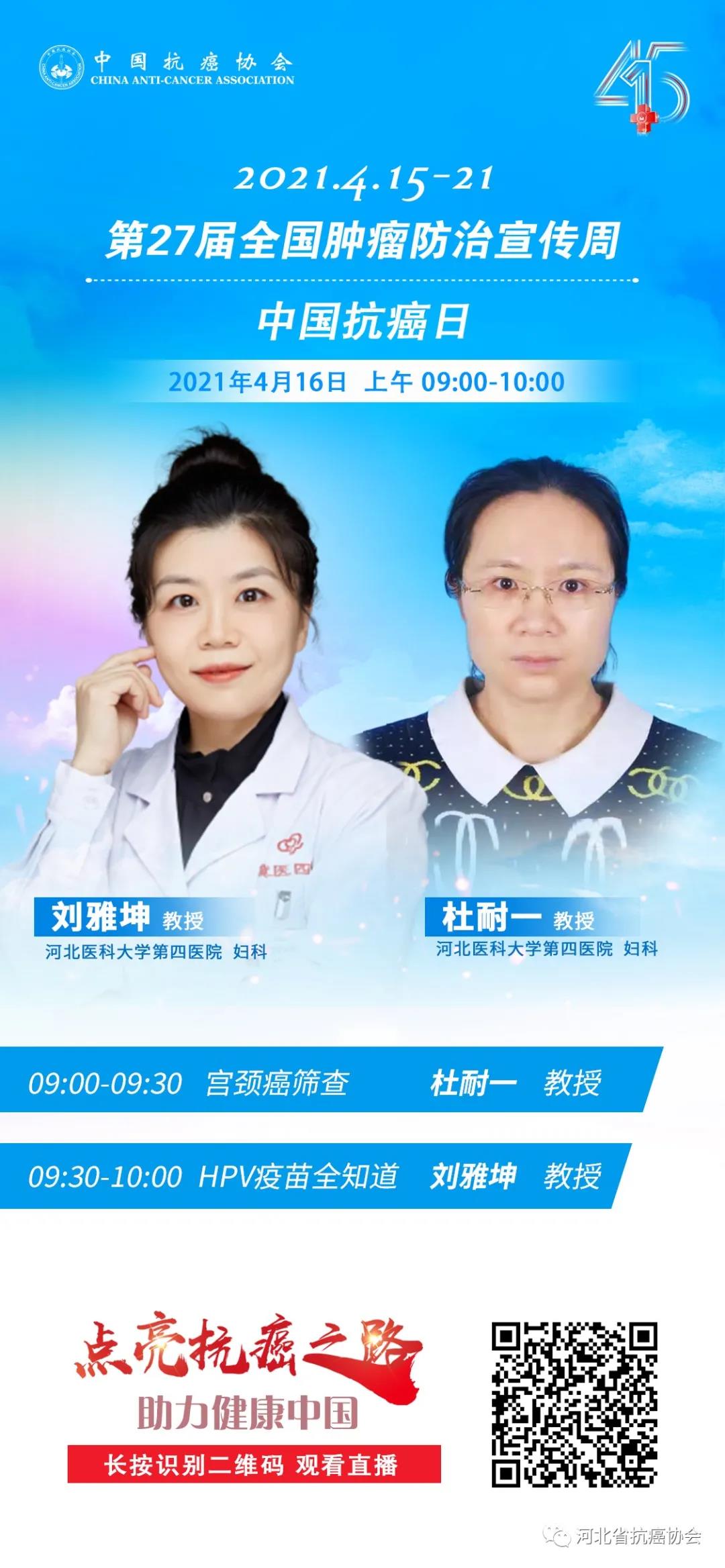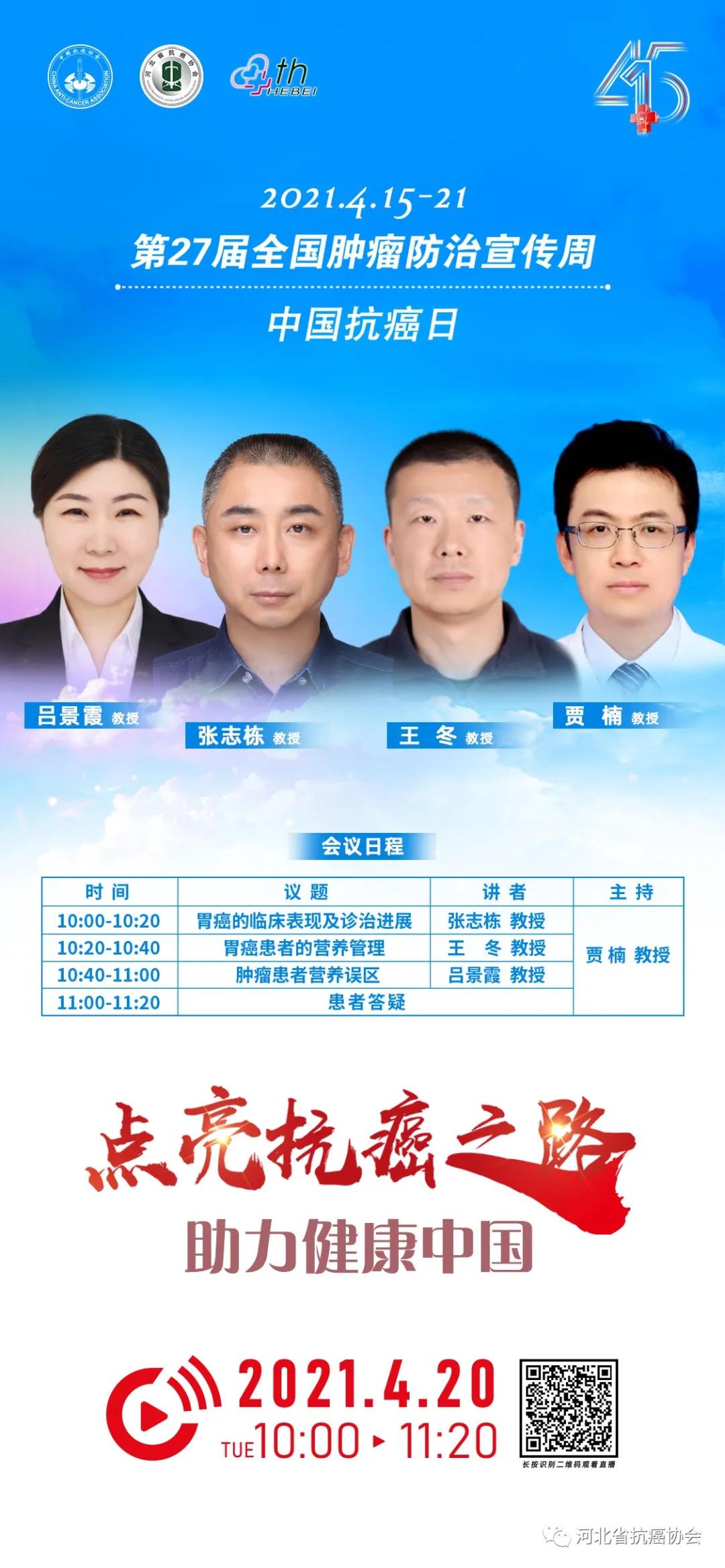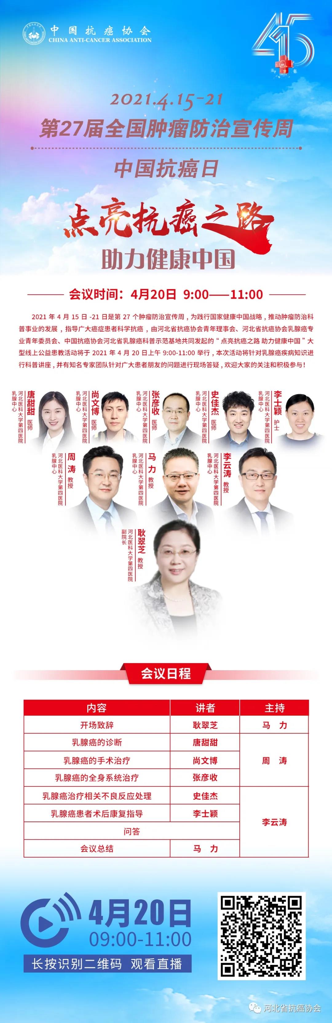 在为期一周的活动中,河北省抗癌协会、河北省癌症中心、各专业委员会、各市抗癌协会都将相继举办形式多样的防癌科普宣传,以医务工作者火热的爱心点亮抗癌之路,助力健康中国!