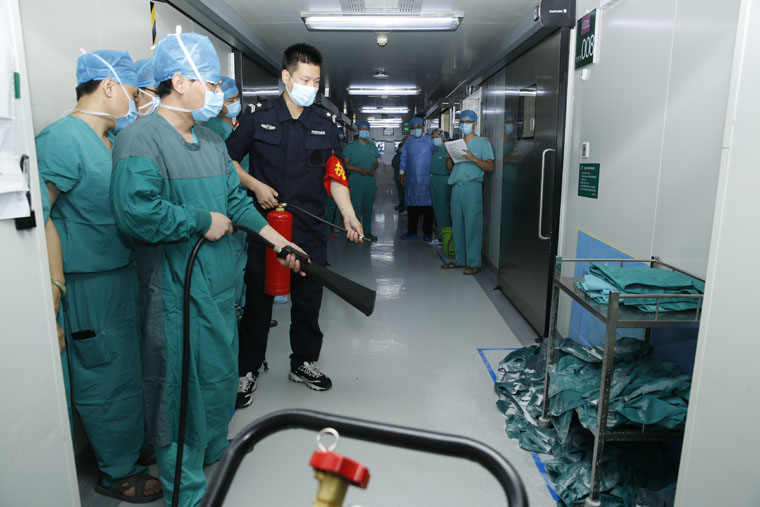 “着火了,着火了!门口起火,大家保持镇静,不要慌张……”720日上午8点,东院区手术室、麻醉科及肝胆外科、乳腺外科20名医护人员在手术室进行的术中火灾应急消防演练。