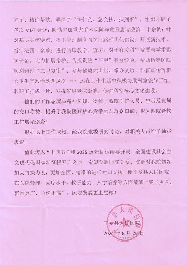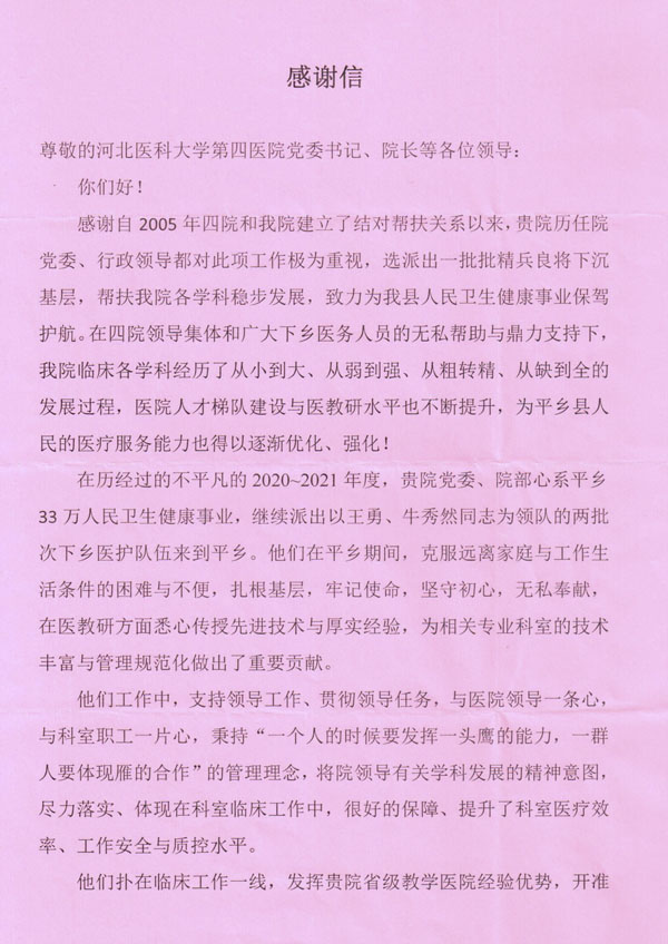 来自平乡的感谢信:我院对口支援取硕果