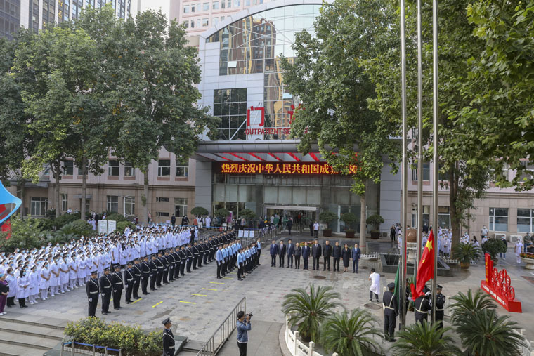 7点40分,升旗队、护旗队步伐矫健地走向升旗台,随着雄壮有力的国歌声响起,五星红旗冉冉升起,全体人员行注目礼,整齐肃穆。随后,院旗伴随院歌升起。单保恩书记代表院党委祝福伟大的祖国繁荣昌盛,国泰民安;祝全院职工、同学和广大患者朋友国庆愉快,阖家幸福。