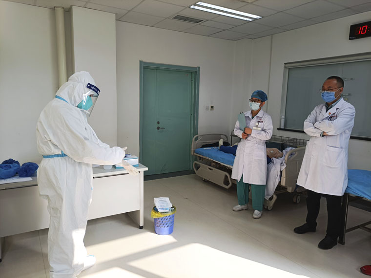 在前期冬奥医疗保障队员先后两次到保障场馆实地踏勘及演练的基础上,本次专项培训模拟医疗站三区两通道设置,开展穿脱防护用品培训,由带教老师一对一指导,要求每位队员严格按照三区两通道设置及穿脱流程进行训练。培训结束后按照评分标准逐项进行严格考核,并对每名队员进行点评,切实保障每位保障队员规范穿脱防护用品。