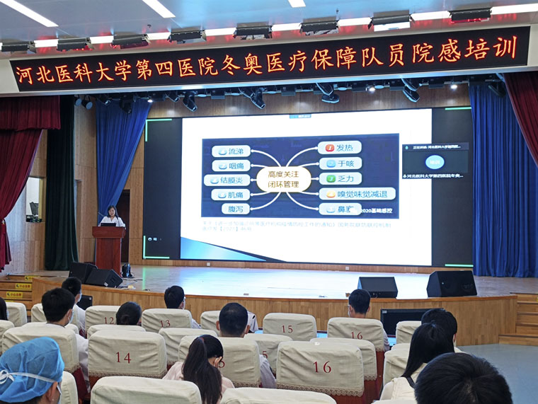 我院院感科王媛副主任在专门的院感培训中重点强调了疫情防控下冬奥医疗保障工作开展的院感注意事项及操作细节,进一步强化了冬奥队员的院感防控意识,及穿脱防护用品注意事项。保障场馆的河北中医学院5名志愿者以线上方式参加了本次培训。