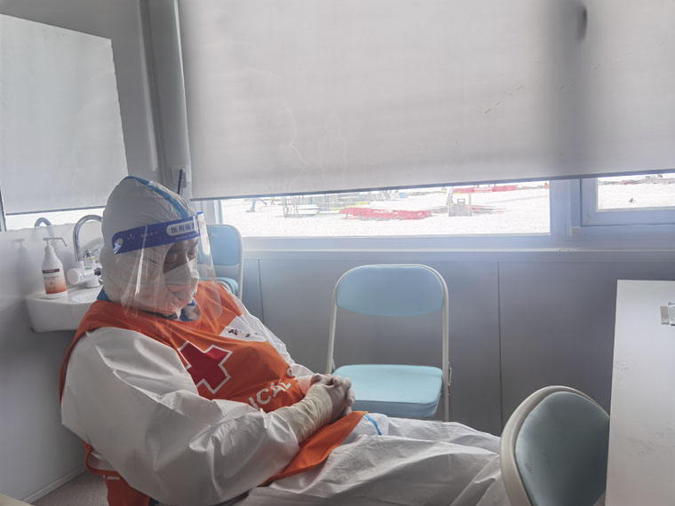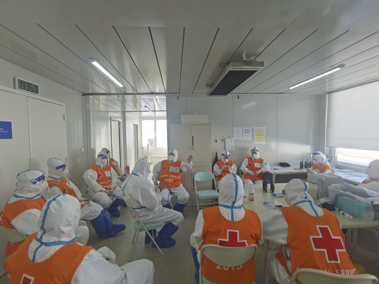 北京冬奥会开幕恰逢春节假期,队员们牺牲与家人团聚的时间,积极投入工作中。在保障期间,队员们根据各类医疗站布局及保障特点,将医疗物资进行合理分类配置;测试医疗设备、集群、视频通话记录仪;全体医护人员集中强化学习和模拟演练,完成了呼吸机使用技能强化培训、AED使用技能强化培训;骨折伤员就诊与病例上报模拟演练、运动员医疗站医护人员和救护车医护人员对接配合救援转运模拟演练、FOP医疗站紧急处置受伤运动员演练等。在两位医疗官何宏涛副院长、赵孝先处长的带领下,大家坚持每日开早、晚例会,早部署、晚总结,查找不足,反复推敲每个诊疗细节,商定解决办法;认真学习医疗救护和防疫知识,不断加深急救及防疫认识,加强了突发事件的处理能力。