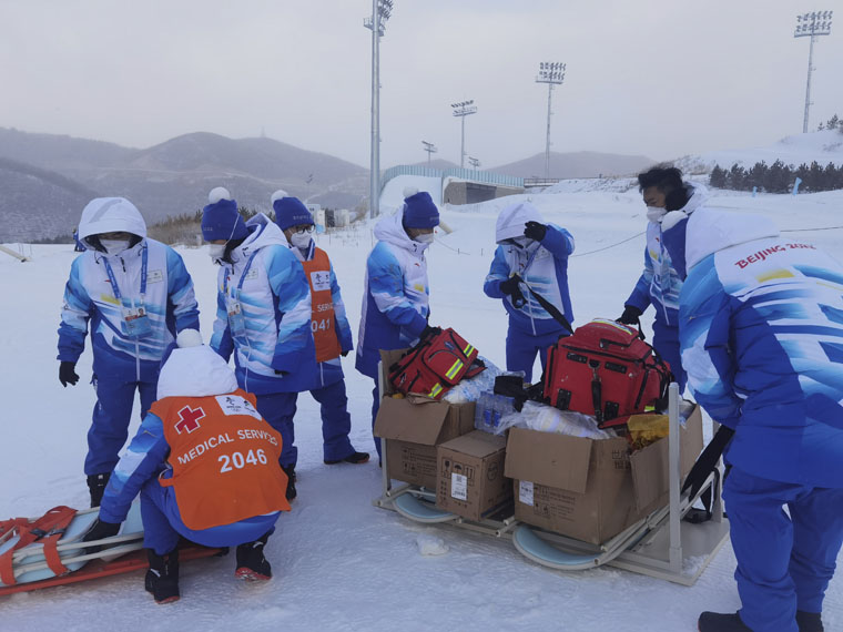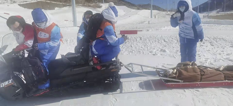 31日,世界残奥北欧滑雪联合会专家汉斯皮特在工作时,随机选取时间和地点,模拟运动员在比赛过程中突然倒地,紧急呼叫医疗救援。医疗服务领域FOP医疗站医护人员得到指令后迅速到位,第一时间检查伤情,给予肢具外固定和包扎后,使用救援雪橇船迅速转运至指定地点,全程仅用时8分钟。演练结束后,汉斯皮特对医疗救护人员快速反应、快速转运、沟通顺畅等给予了充分肯定。