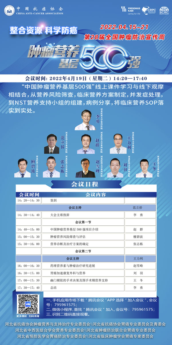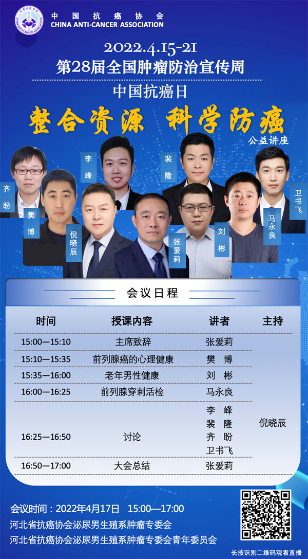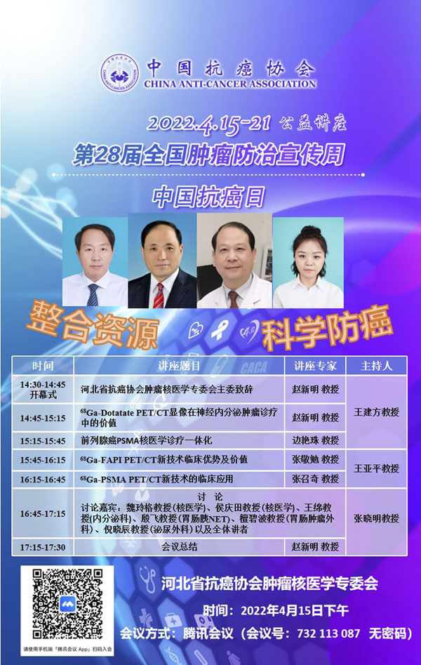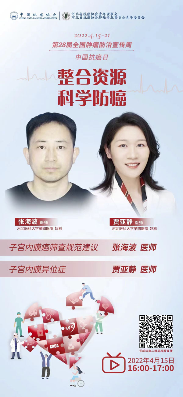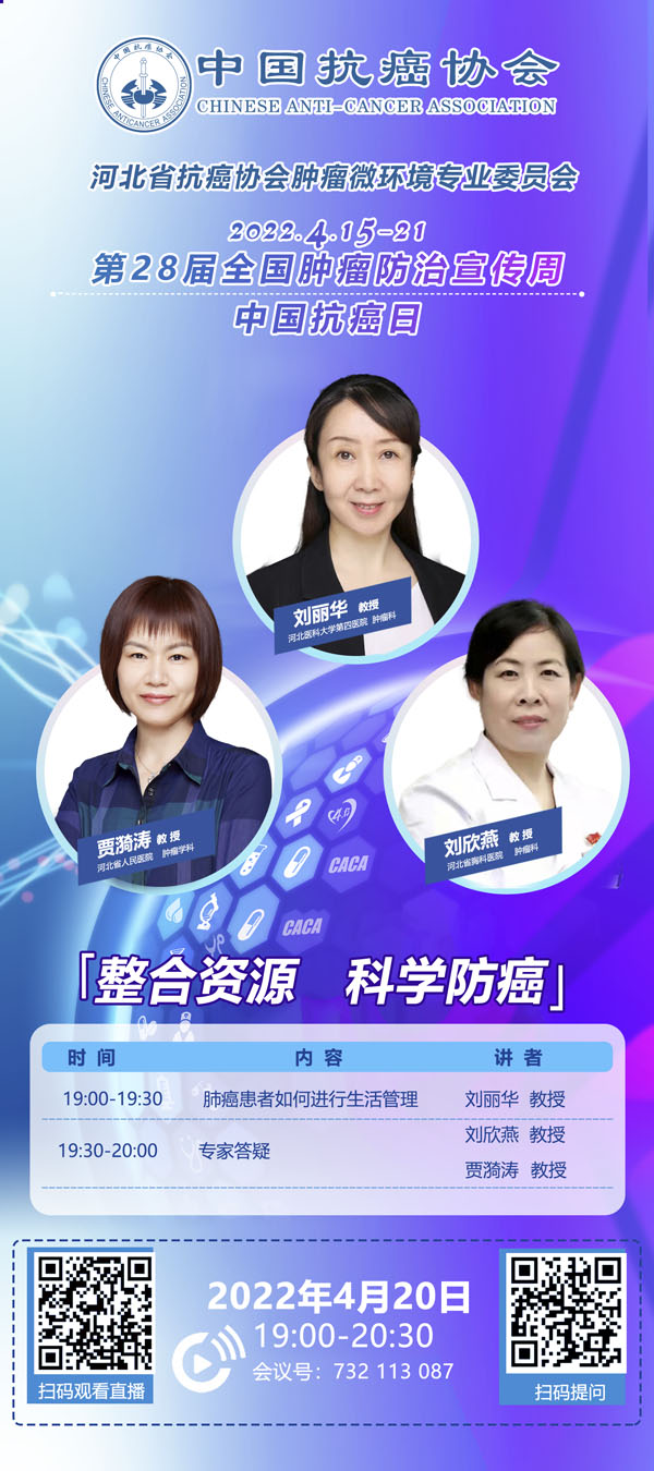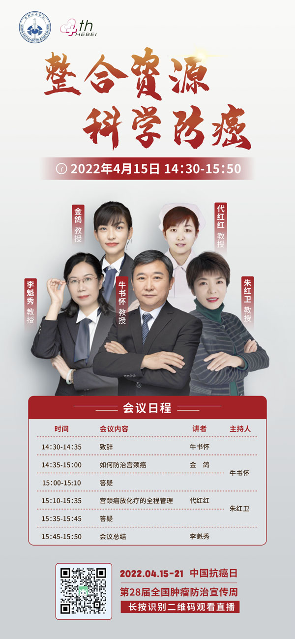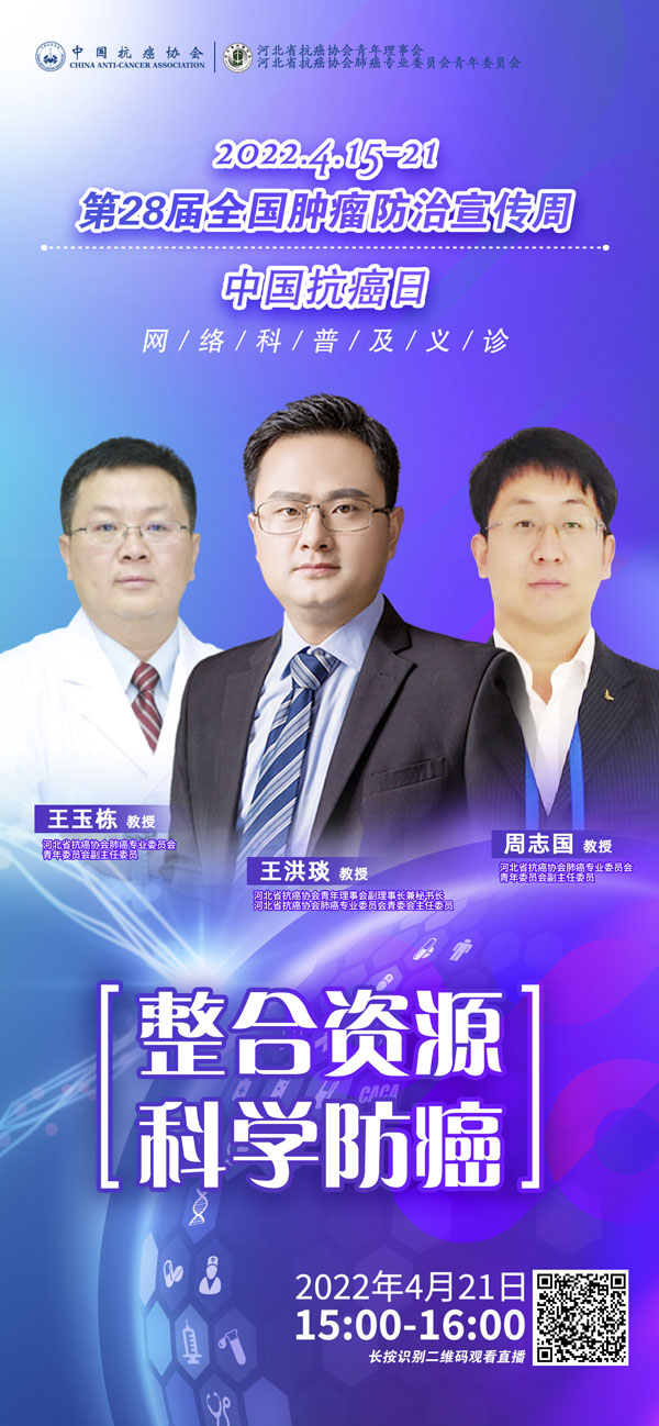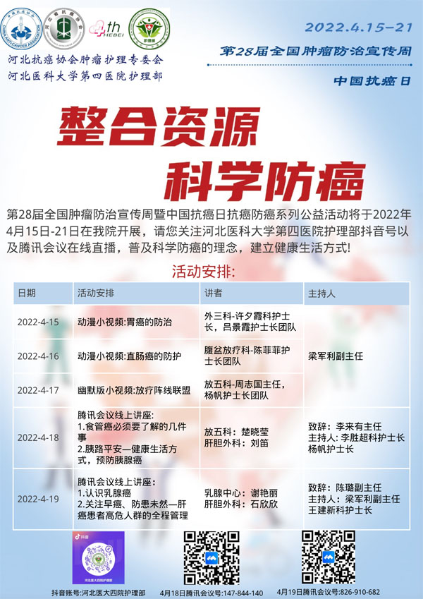 415-21日是我国第28个全国肿瘤防治宣传周,今年宣传周主题是“整合资源 科学防癌”。为贯彻落实健康中国癌症防治行动,进一步提高全社会癌症防控意识,营造全民防癌抗癌的良好氛围。由河北省抗癌协会、河北省肿瘤防治办公室主办的第28届全国肿瘤防治宣传周/中国抗癌日,河北省启动仪式将于2022415日在保定正式启动。