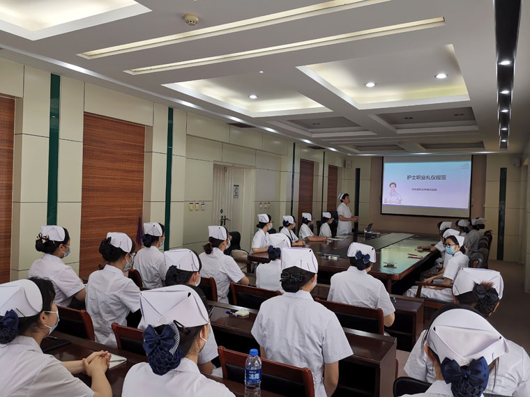 护理部主任李来有做了《护理实习生安全管理》专题讲座,强调做好护理职业生涯规划的重要性,并以具体的临床案例讲解了护理安全管理和护理实习安全策略,要求大家要认真学习医院规章制度并严格执行。护理部副主任陈璐和消化内科魏金梅老师分别向东院和本部的同学们从仪表礼仪、言谈礼仪、体态礼仪和日常工作礼仪等方面进行了护士职业礼仪规范培训,并强调了着装、交流方式与身体语言等的重要性。