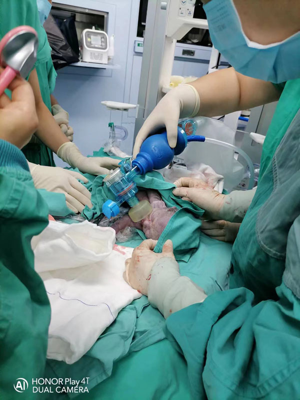 经过综合评估孕妇病情,诊断为妊娠期高血压性心脏病心功能III级、重度子痫前期,妊娠风险等级为高风险(红色标识),孕妇已经出现合并症和并发症,病情危重。东院产科随即与麻醉科贾丽主任、新生儿科沈颖主任、手术室李淑军护士长积极沟通,组织科室会诊,各科专家达成统一意见,在充分做好备血、新生儿窒息复苏等各项准备情况下立即进行剖宫产终止妊娠,同时制定了缜密可行的手术麻醉方案及术中、术后突发情况的应对措施。