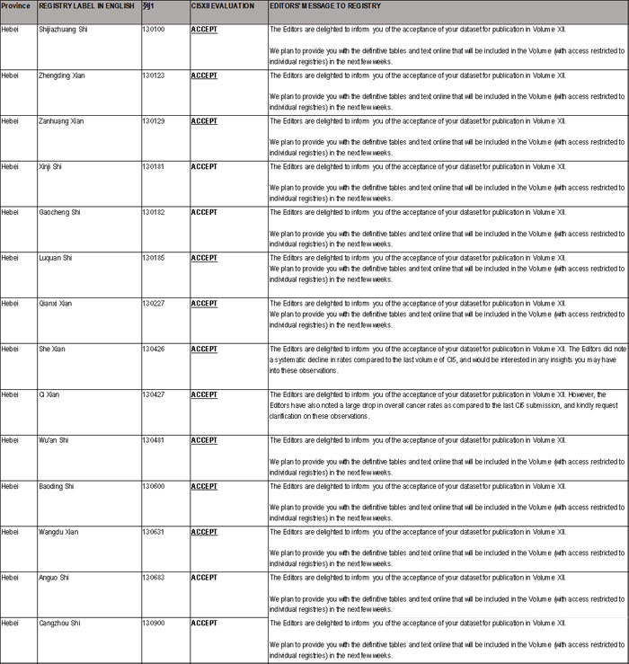 河北省14个登记处被《五大洲癌症发病率》第12卷收录情况