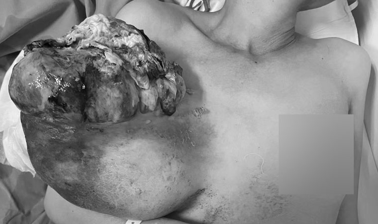 患者为一名53岁女性,自述右乳肿物已有3年。近3个月迅速增长至“足球”大小,且出现破溃、感染、出血,严重影响日常生活。经过当地两家医院问诊,均被告知无法治疗,建议转上级医院。患者来我院乳腺中心专家门诊就诊时,体貌消瘦,面容贫血,双手托着乳房肿物,肿瘤溃破出血浸透了包裹多层的纸巾和护垫,可以闻到浓烈的伤口腐败味道……耿翠芝教授对患者进行详细检查发现,除皮肤脱水、无弹性外,患者营养状况极差且伴有心率快、血色素低、水电平衡紊乱等问题。