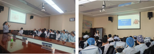 培训会上,我院乳腺中心李赛男医师对胸壁输液港的植入及取出流程的难点、重点进行剖析。乳腺中心刘磊护士针对输液港维护流程进行规范化培训。