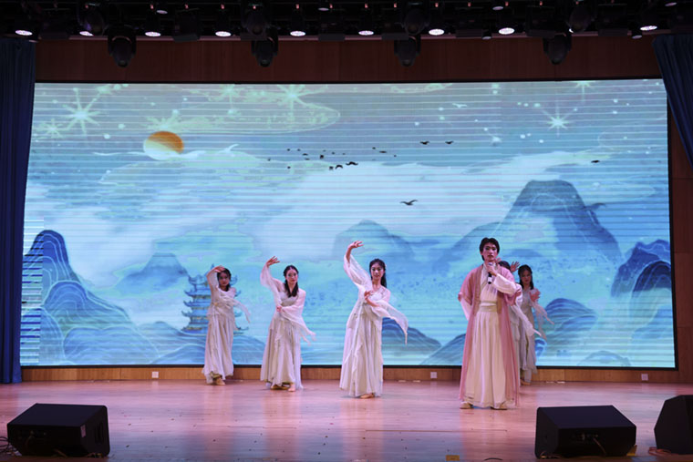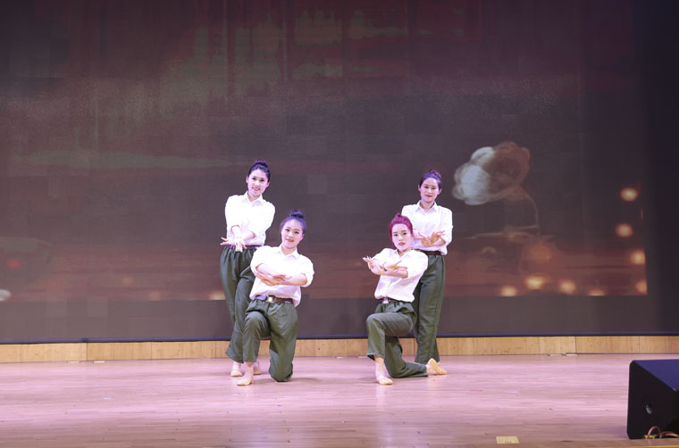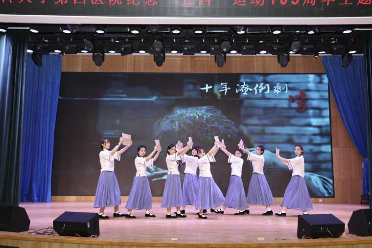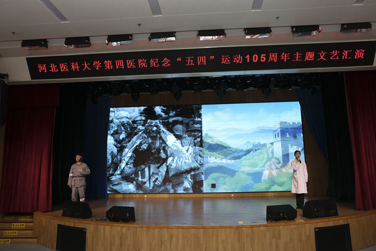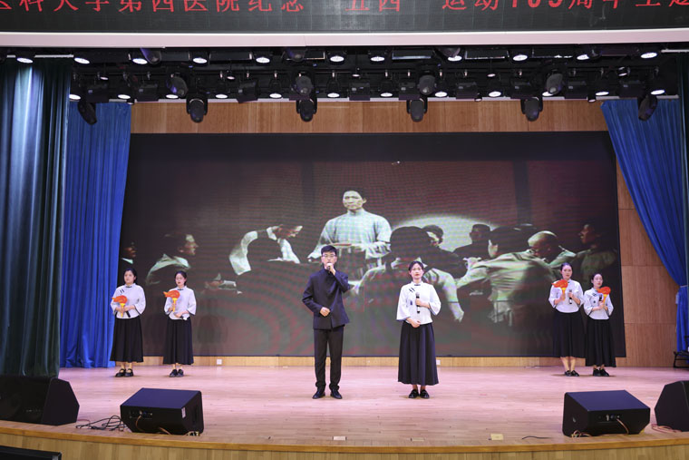 表彰大会后,纪念五四运动105周年主题文艺汇演拉开帷幕。整场演出分为两个篇章,团员青年们自编自导自演,以歌舞、朗诵、情景剧等形式,演绎了现代青年与五四志士的“时空对话”,表达了大家对100多年前为追求“爱国、先进、民主、科学”而献出热血、付出生命的有志青年的敬佩和怀念之情,展现了四院青年不负韶华、昂扬向上的精神风貌,诠释了四院人平凡而伟大的奋斗故事。
