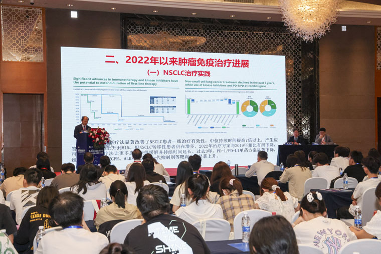 吉林大学一医院崔久嵬教授、天津医科大学肿瘤医院王晶教授、广州医科大学附属第一医院谢展鸿教授、郑州大学第一附属医院蒋军广教授进行讨论互动。中山大学附属第五医院林忠教授、北京大学肿瘤医院陈克能教授、河北大学附属医院商琰红教授分别以《小细胞肺癌化疗治疗进展》《食管癌诊断治疗展望》《靶向药物规范化诊疗的双重获益》为题做学术分享。