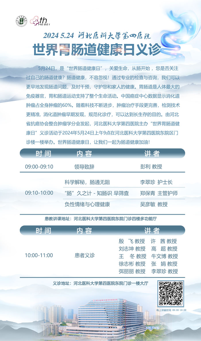 今年5月24日是“世界肠道健康日”,河北医科大学第四医院将在东院区举办义诊宣教活动。胃肠道是人体最大的免疫器官,胃和肠道运动支持了整个生命活动。中国癌症中心相关数据显示,消化道肿瘤占全身肿瘤的60%,随着科技不断进步,肿瘤治疗手段更完善,检测技术更精准,通过早期发现、规范化诊疗等方式,对消化道肿瘤的治疗可以实现长期生存的目的。