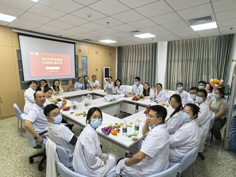 座谈会围绕医患沟通、教学活动、临床与科研等话题展开,氛围轻松愉快,教师们毫无保留地分享自己的“皮肤科之路”,学员们敞开心扉、畅所欲言,表达了科室培训期间的感受和收获,也为皮肤科住培教学工作的发展建言献策,同时提出了临床、科研和生活中的困惑。老师们悉心倾听大家的感受并答疑解惑。几位即将毕业的住培学员表示,住培学习的经历难忘且宝贵,要珍惜每一次的学习机会,保持热爱、坚持不懈,争取早日成为一名优秀的医生。