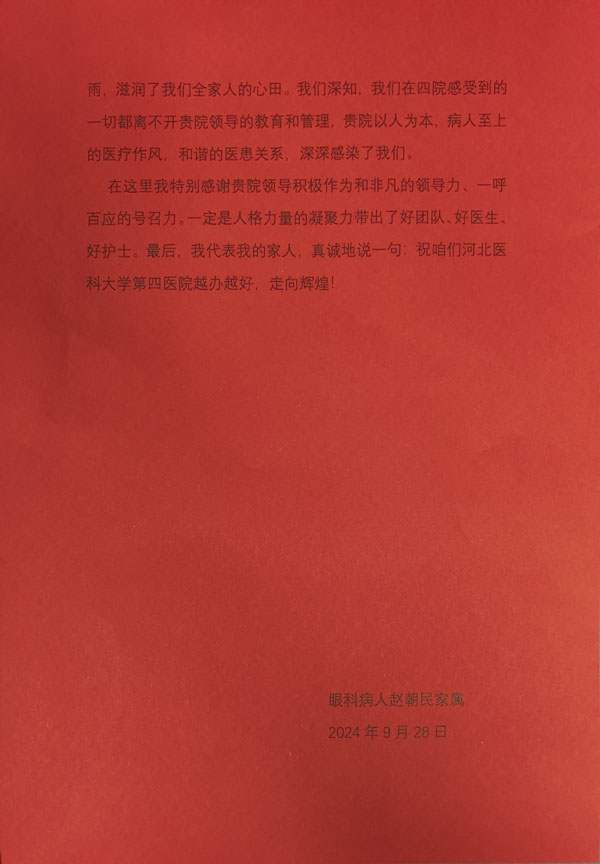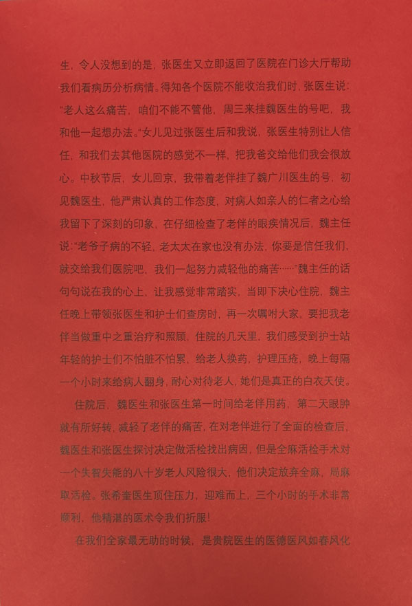 “我们来送锦旗和感谢信了!在最无助的时候,是你们把医者仁心的关怀给了我们,我们发自肺腑地表示感谢!”。近日,我院眼科为一名特殊患者行双眼眶内肿物切取活检手术,并在术后联合血液内科制定了个性化联合治疗方案,经过医护团队11天的精心治疗与护理,患者顺利出院。