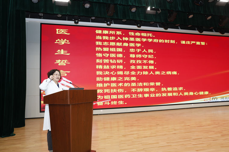 “三个老师”代表、麻醉系主任贾慧群教授的领誓下,全体新生庄严宣誓,立志为医药卫生事业的发展贡献青春力量。