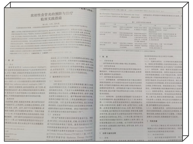 放射性食管炎在食管癌、肺癌等肿瘤的放射治疗中较为常见,对患者生活质量有一定影响。文章聚焦这一难题,系统阐述了放射性食管炎的定义、发病机制、临床表现、分级标准、诊断鉴别方法和风险因素,针对急性和晚期放射性食管炎给出全面的治疗方案,并提出了一系列有效的预防措施。文章为临床实践提供了科学、规范且具操作性的指导,有助于提升放射性食管炎的防治水平,帮助减轻患者痛苦,提高生存率。