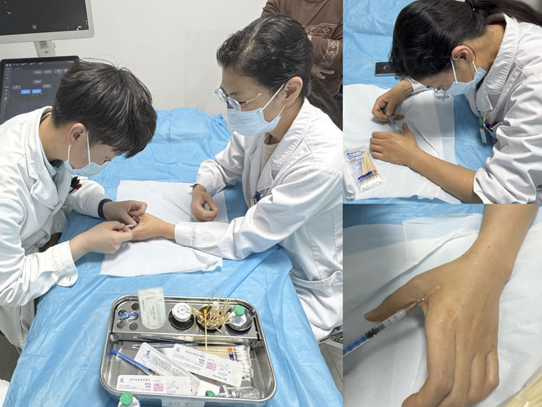 科室负责人纪晓惠将造影剂注射至自身体内,试验淋巴管超声造影技术