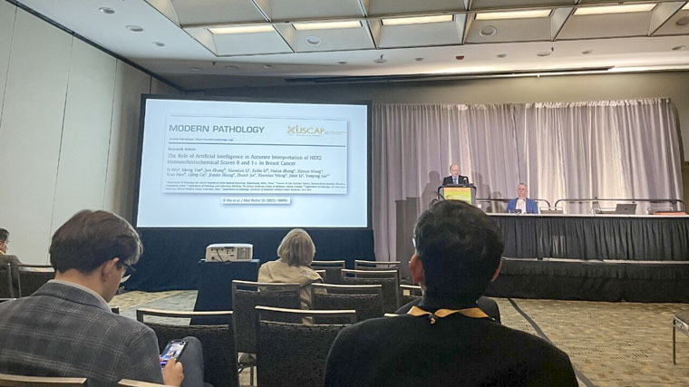 近年来,我院病理科持续紧跟国际前沿,累计获得7项口头发言和20篇壁报交流,相关学术成果发表在Modern Pathology、ESMO OPEN、Lab Investigation等国际顶级期刊。特别在2024年USCAP年会中,病理科主任刘月平教授团队,有关乳腺癌病理人工智能研究入选了全球病理最具影响力的5篇研究,并在“USCAP期刊精选”分会场进行研讨,充分彰显了我院病理科的科研实力。