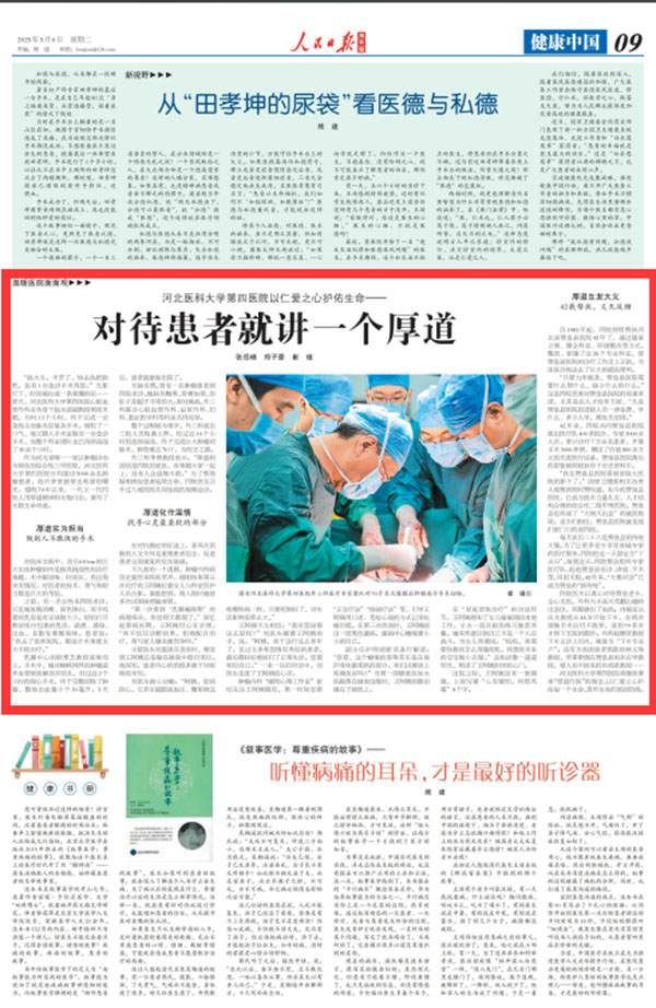 厚道,是一种兼具道德厚度与行为温度的价值准则,不仅是衡量医德的精神刻度,更是践行医者初心的精神底色。近日,《人民日报》以《对待患者就讲一个厚道》为主标题,生动报道了我院医务工作者传承“厚道行医”文化,为无数家庭点亮生命曙光的感人事迹。历经70载风雨洗礼,一代又一代四院人用实际行动诠释着“厚道”内涵,现原文转载如下。