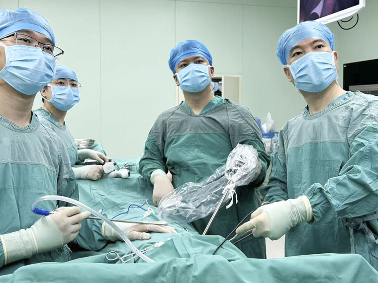 温士旺教授与孙博康主治医师选择创伤最小的单孔胸腔镜进行手术。术中难点在于左主支气管及分支被血凝块完全堵塞,为保护健肺,离断血管后,温士旺教授果断剪开左肺下叶支气管,敞开残端,迅速进行高难度“逆向抽吸”,尽力清除左主支气管及左肺上叶支气管内积血。但受限于支气管角度,部分深部积血难以清除。危急时刻,他当机立断,迅速严密缝合支气管残端,随后,孙博康主治医师在其指导下行支气管镜吸除术,成功清除大量血凝块。