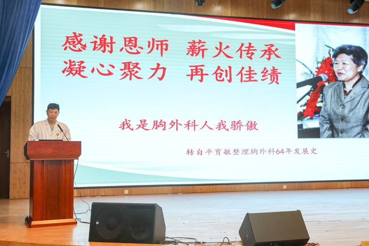 田子强主任着重讲述了我院胸外科的发展历程,他指出,作为国家临床重点专科,我院胸外科在全国胸外科取得的地位和成绩,与老一辈胸外科人艰苦创新、励精图治、举贤任能是分不开的,正是有张毓德、杜喜群、王其彰、平玉敏等老前辈的艰苦奋斗,才为胸外科的建立和发展打下了坚实的基础。他们开拓、创新、拼搏、奉献的精神,为胸外科事业发展奋斗终身的坚定意志,都是我们应当传承和发扬的不朽精神,值得后代每一位胸外科医师学习、领悟并深刻践行。