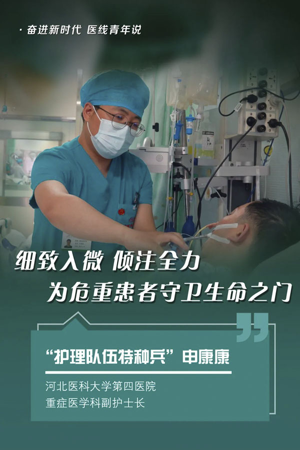 512日是第112个国际护士节,在传统观念中,“护理”这个职业总是与女性的“温柔”“细心”等形容词关联在一起。近年来,越来越多的男护士加入护理队伍,他们被亲切地称为“男丁格尔”。河北医科大学第四医院ICU的副护士长申康康身为“男丁格尔”,已经扎根在重症医学科17年,他不仅用青春诠释了对护理事业的执着与追求,也用奋斗一次次创造生命的奇迹。